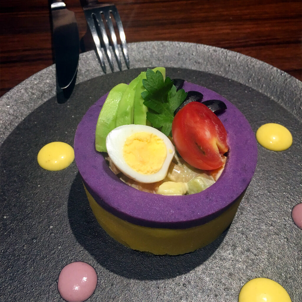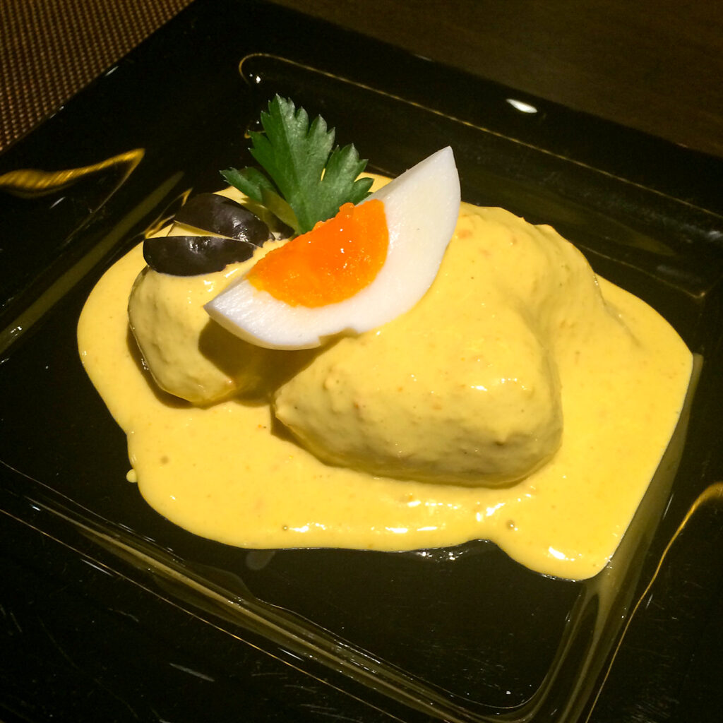 アヒアマリージョ(ペルーの唐辛子)で味付けしたマッシュポテトがベース。凄い色だ。