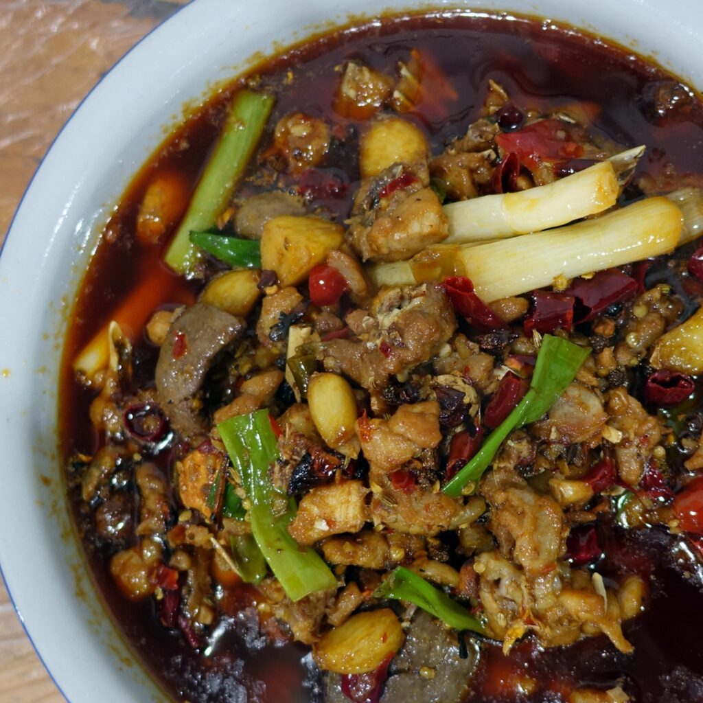 激辛の街、自貢市「飛虹魚館」での1軒目は鯉の卵でした。2軒目は、激辛兎を食べますー。(2017年12月)