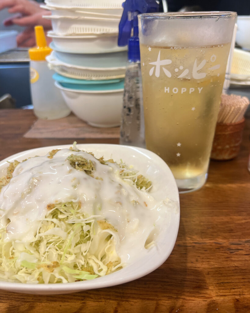 隣のおじさんが旨そうに食べてたので注文。奥に見えるのはキャベツベーコン。