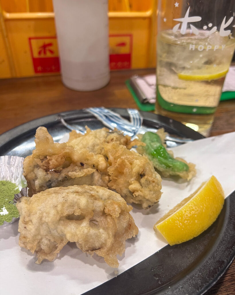 牡蠣天。フライもいいけど天ぷらもね。牡蠣をつまめるのはうれしい。