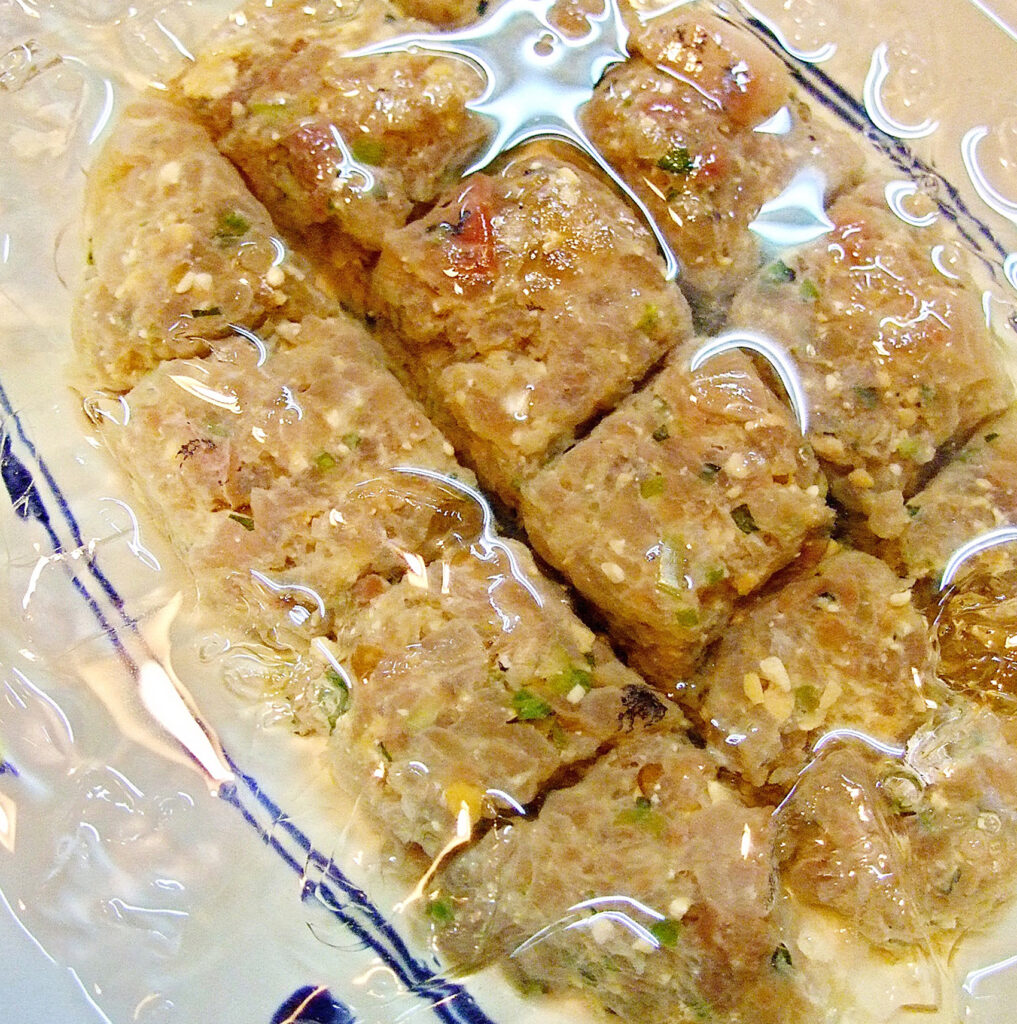 鰺をなめろうにして酢に浸す。表面が白くなるまで〆加減が進むと食べ頃。