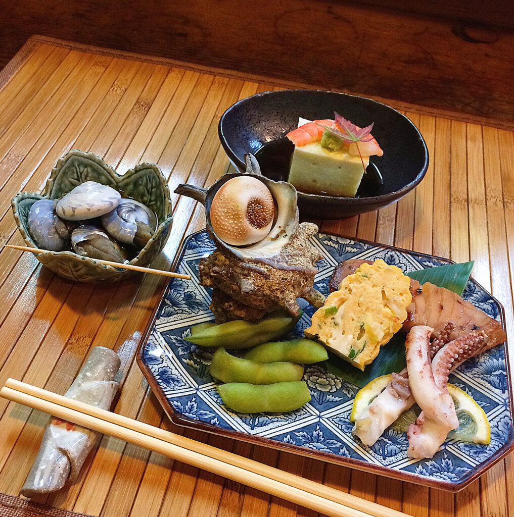 前菜のながらみが懐かしい感じ。種名はキサゴ、くるくる出してつるりと。千葉ではよく見かけますね。