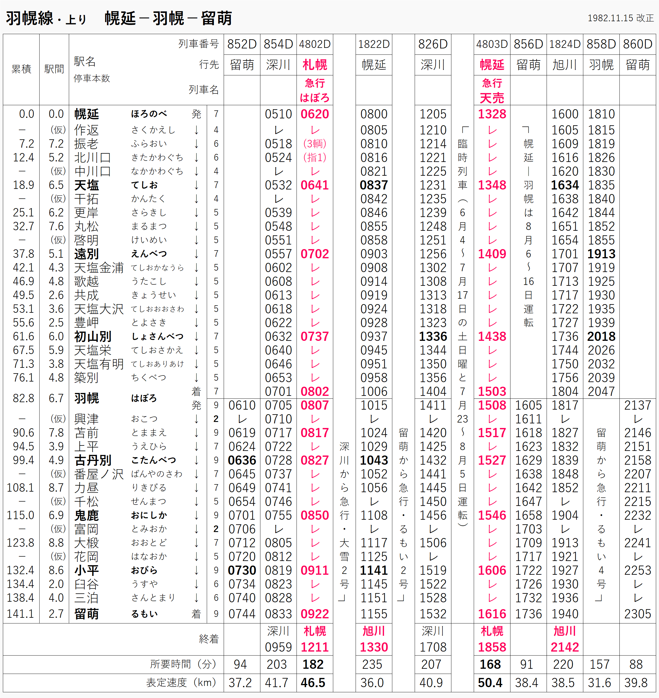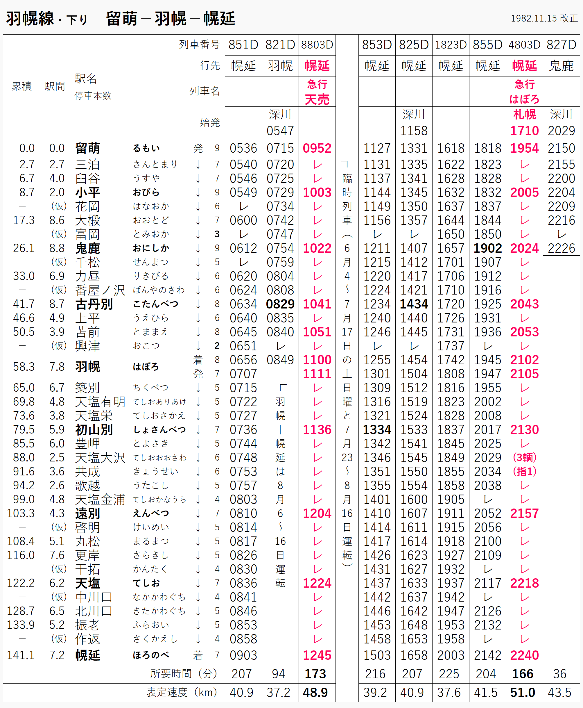 1983年の時刻表、下り。留萌本線のときにも書いたけど、