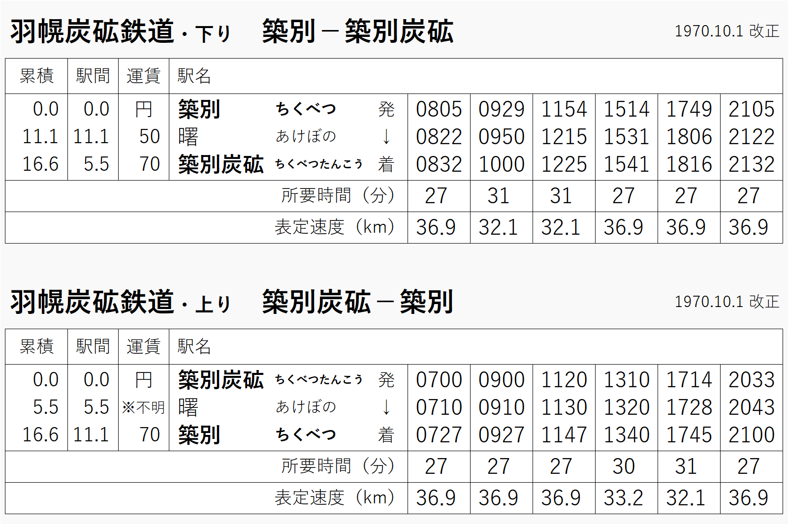 その名羽線の一部として生まれた羽幌炭礦鉄道(築別-曙)は、1941年~1970年まで営業。廃止直前のダイヤはこんな感じでした。