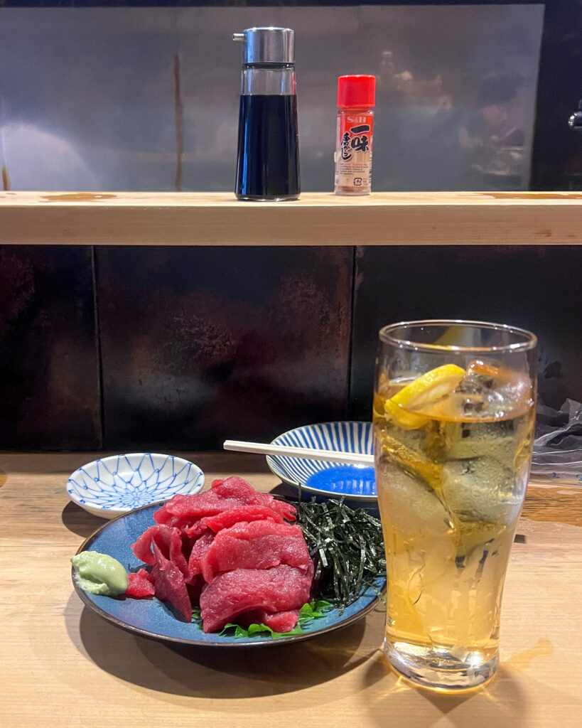 牛にこみ、しめさば、中落ちあたりがスターターになりますかね。酒はハイボール。