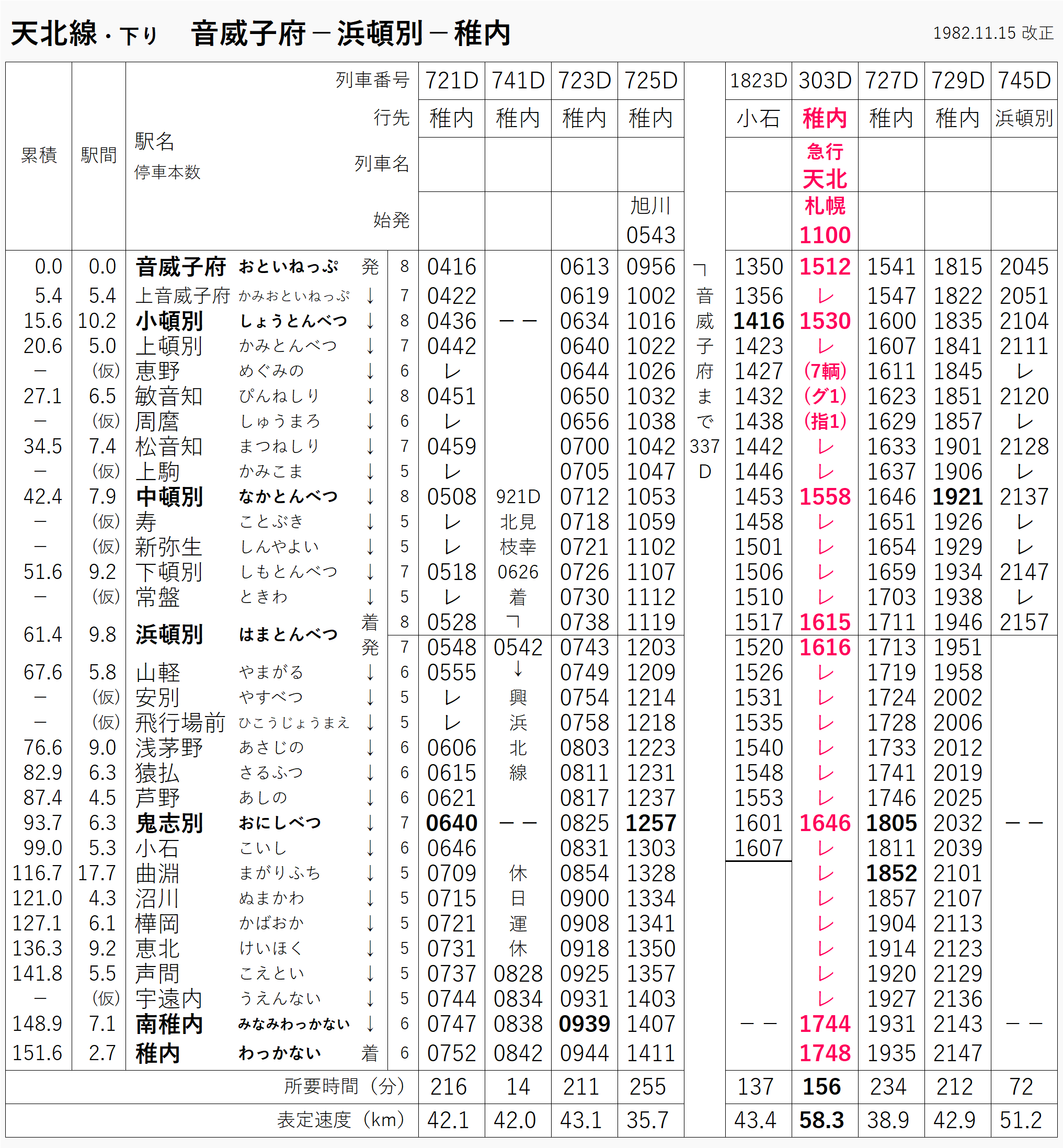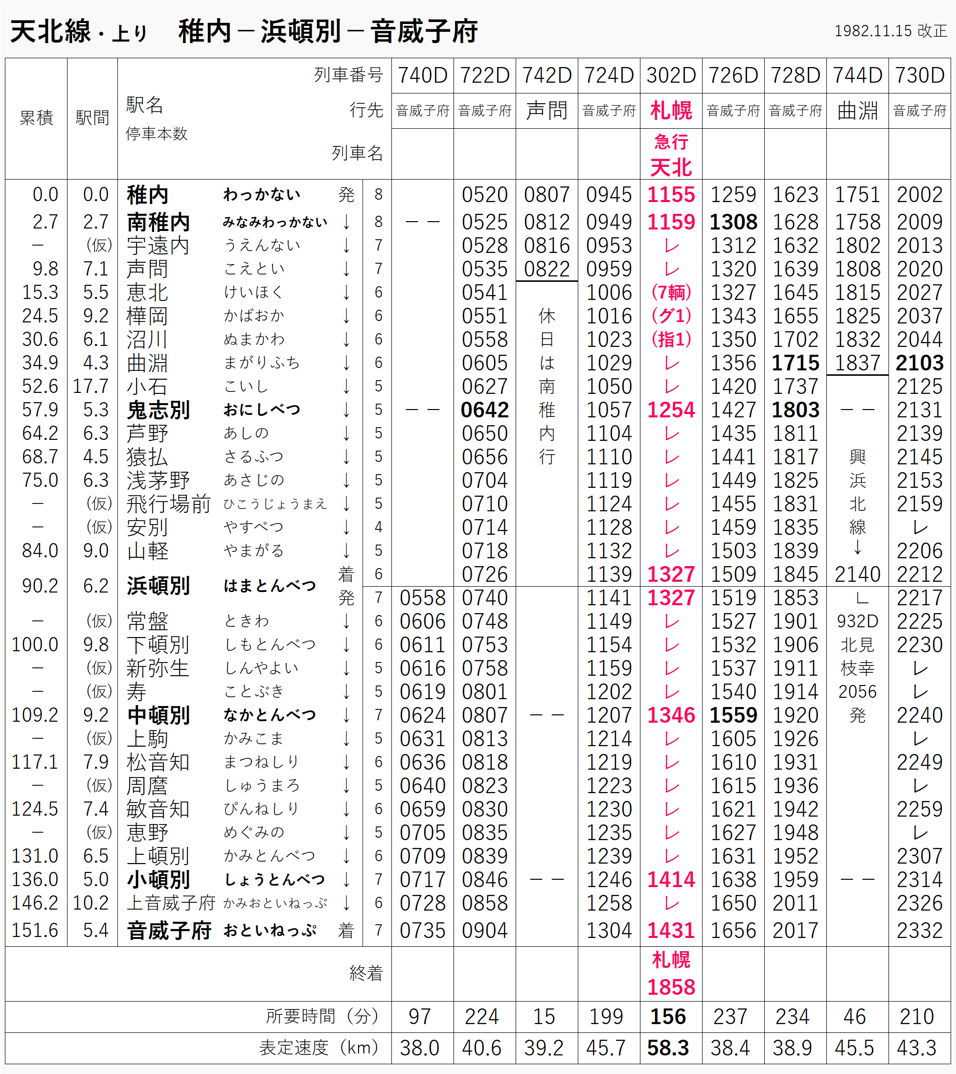 実際の時刻表には、弁当の欄に人口が書いてあるのが謎w しかも名寄だけ。34,500人。いかずし弁当(600円)が食べたい。