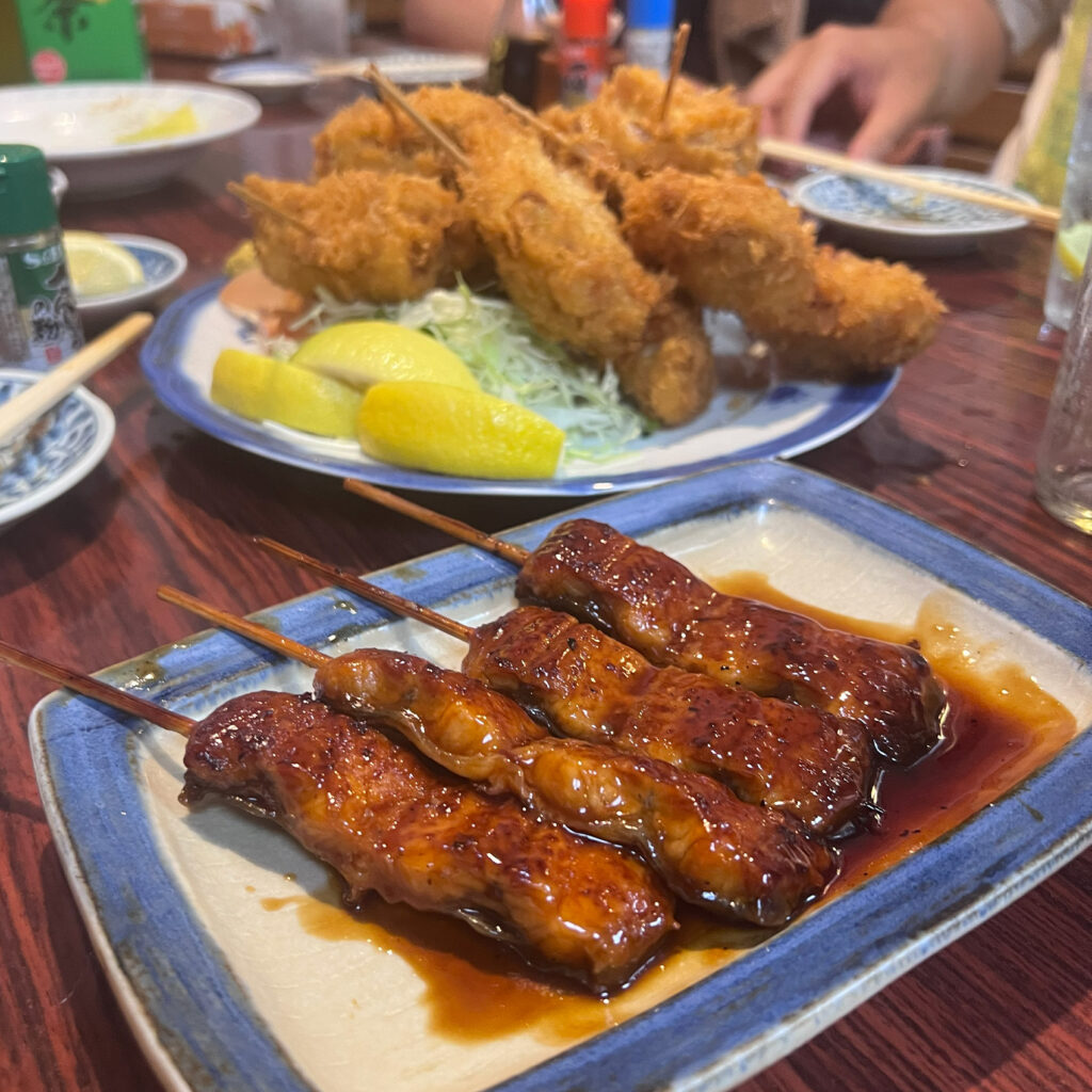 宴会の串たち。6人でテーブルを囲む。ガンガン頼んでも食べられるので最高っす。