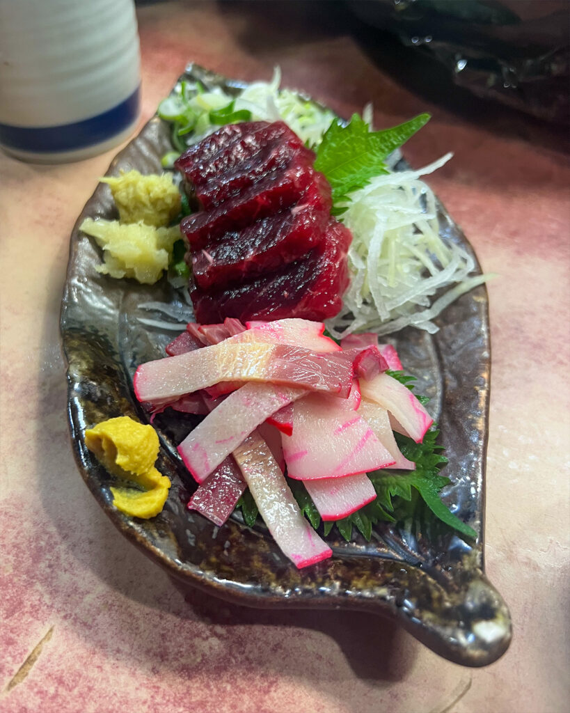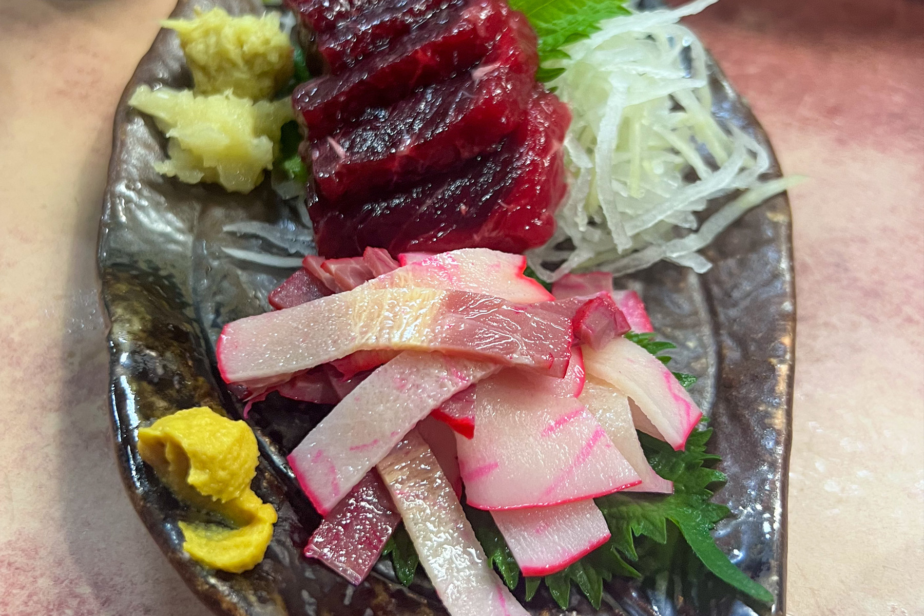 赤貝刺。酒は赤星→冷酒→燗酒。