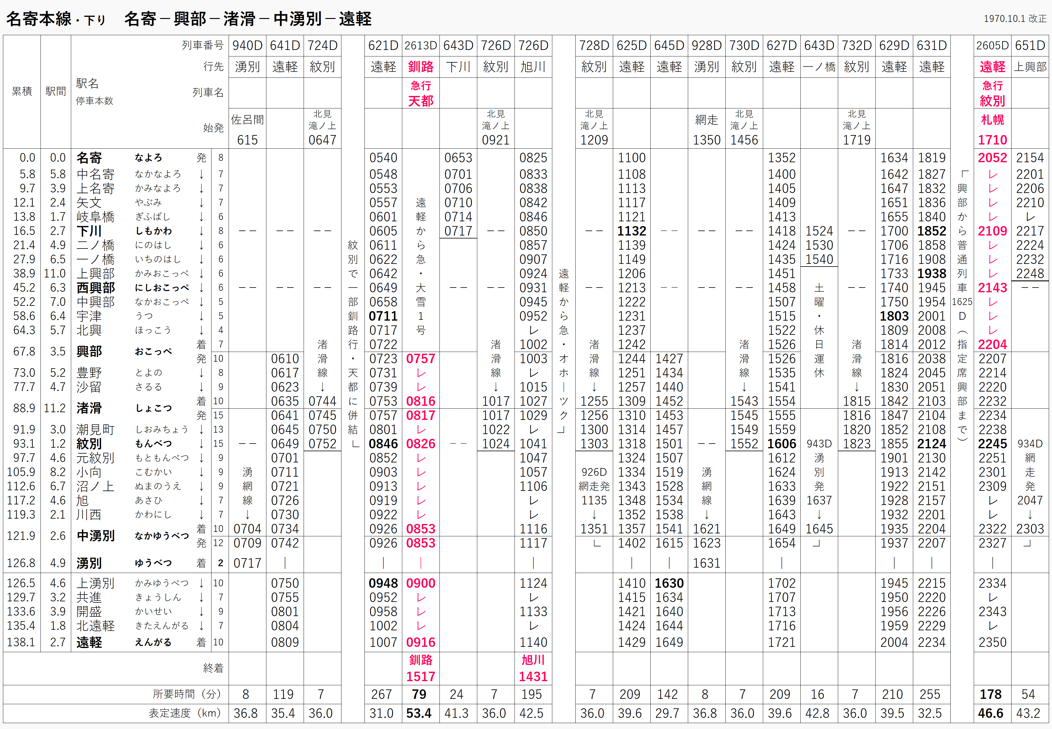距離が短いのも肌感としては意外ですが、1970年の時刻表。