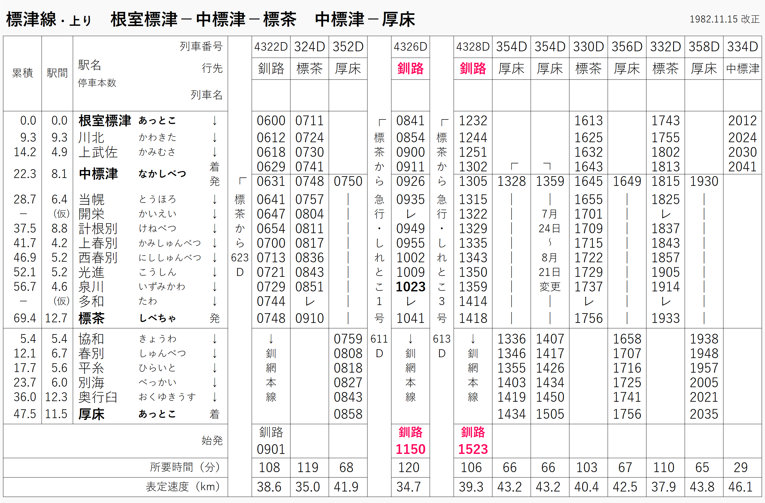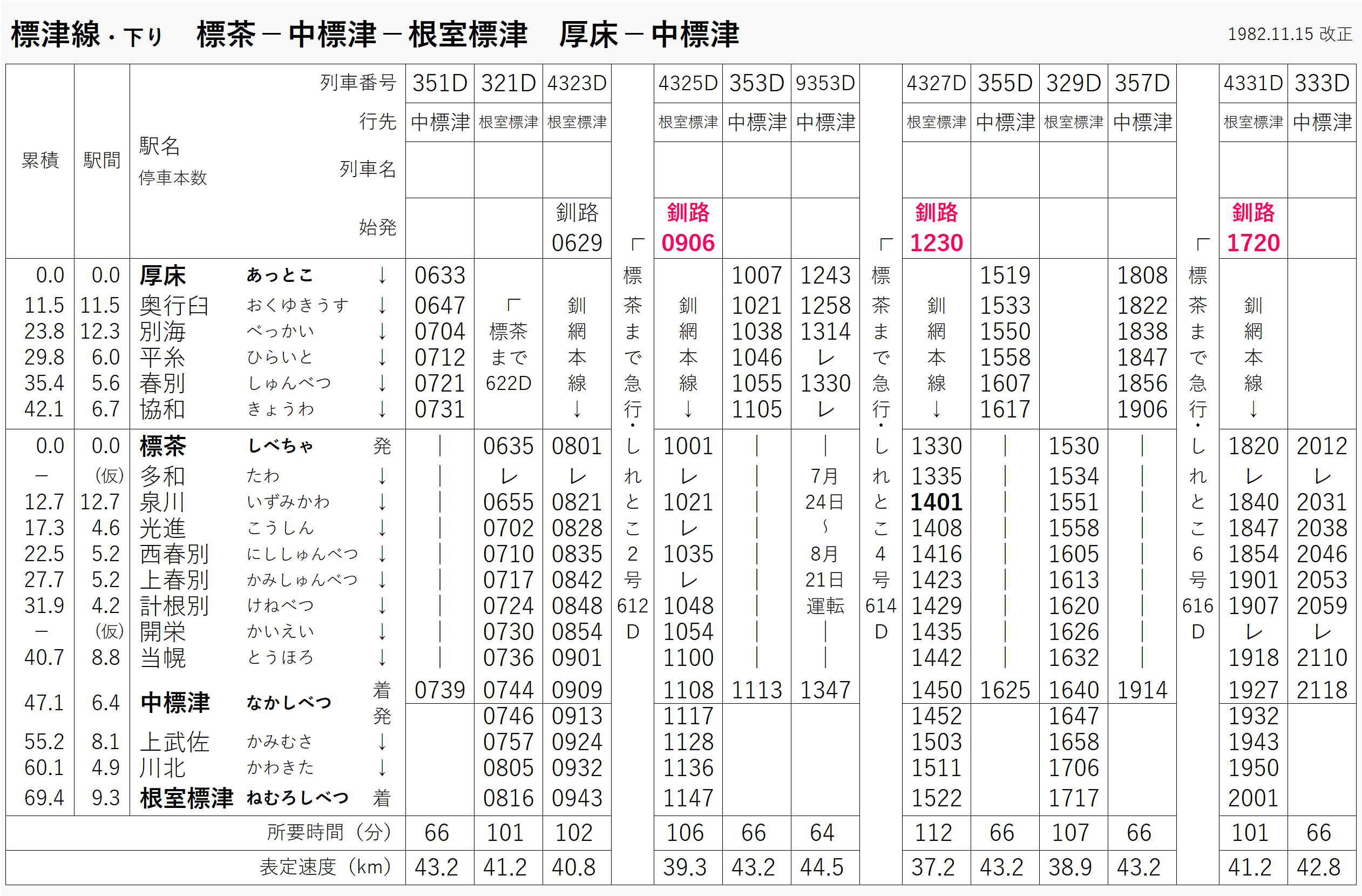 1970年の時刻表と比べると、中標津まで走っていた急行は廃止(しれとこは線内普通)、本数も減っている。