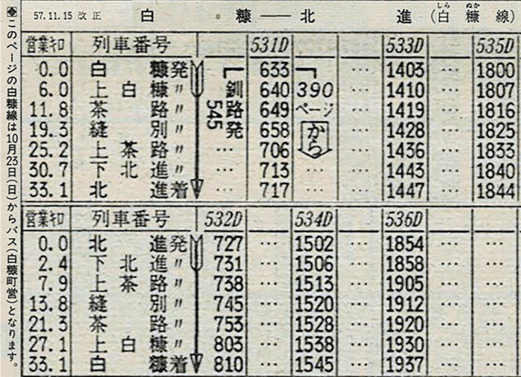 一日3往復。これは廃止同月の1983年10月号。時刻表の左端に悲しいお知らせがありました(レイアウトは切り貼り)。