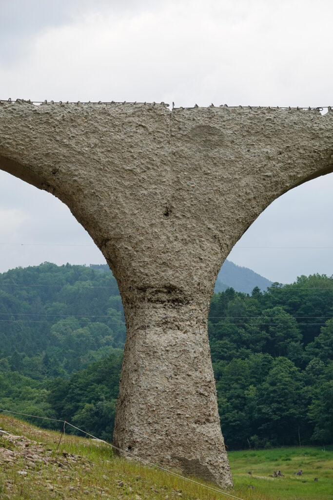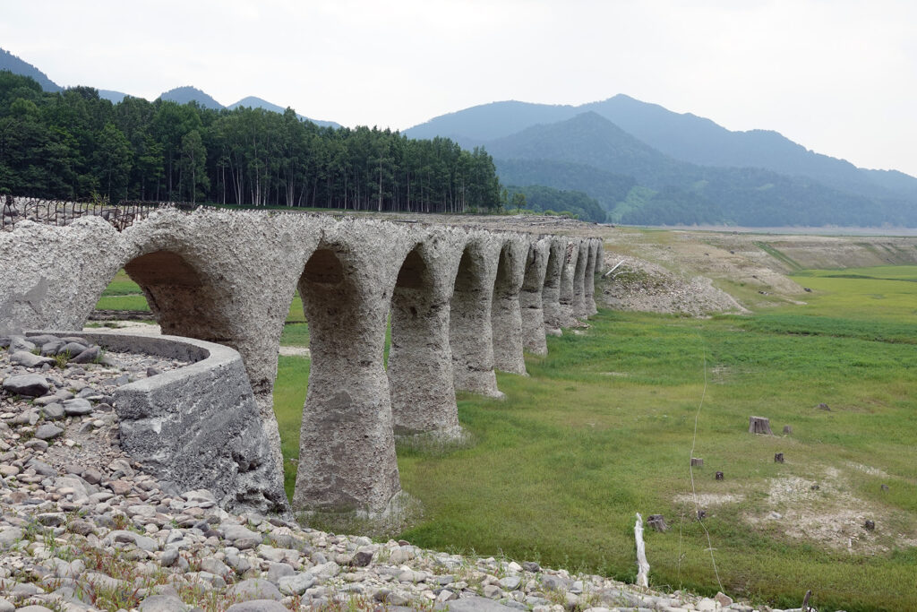 1939年構築。糠平ダムの建設により、士幌線は1955年にルート変更。線路は撤去されたが、橋梁はそのまま湖に水没した。(訪問は2019年7月31日)